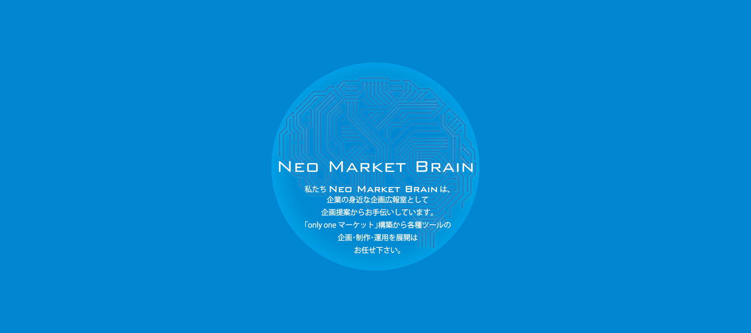 ◆only oneマーケット構築◆現在のマーケットは、サイトやSNSなどのデジタル世界と現実世界での人との関わりをバランス良く展開していかなければなりません。企業規模、業種、業界、商品、サービス、地域性など様々な要因からデジタル(IT市場)とリアル(現実市場)マーケットをバランス良く組み合わせたonly oneマーケットを構築する事で独自のスムーズな経済活動が可能になります。私たちNeo Market Brainは、様々な経験を活かし最適なonly oneマーケットを構築しています。